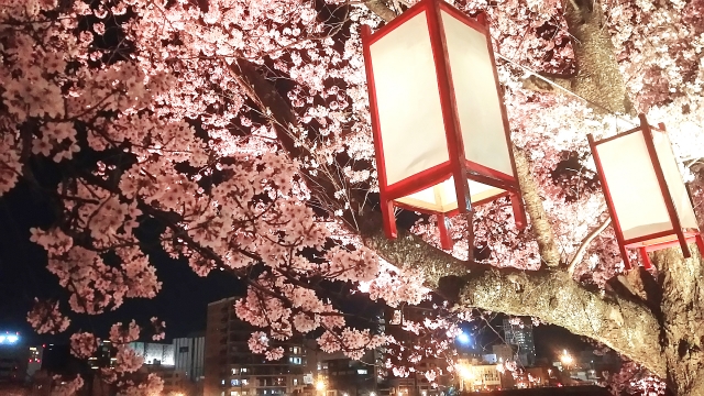 ライトアップされた桜が水面に映り込み、昼とはまったく違う表情を見せてくれます。