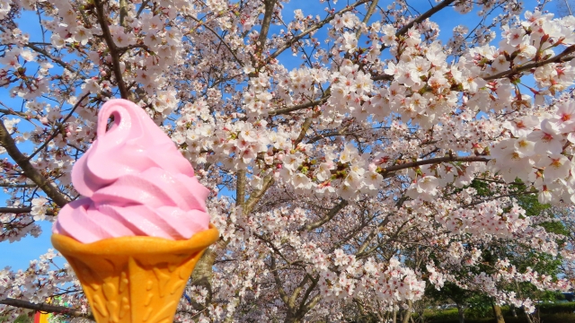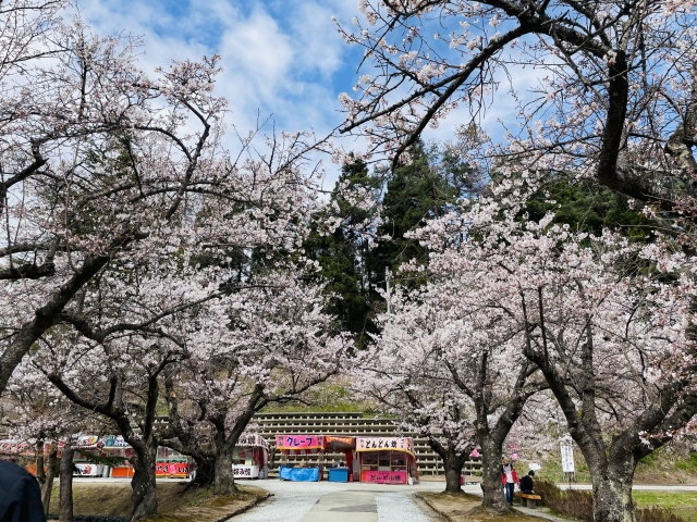 広い園内に約3,000本の桜が咲き、開花シーズンになると食べ歩き目当ての人も一気に増えてきます。