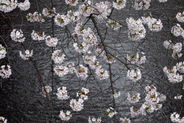 満開を少し過ぎると、風や雨の影響で花びらが舞い始め、川面を流れる「花筏(はないかだ)」が見られる年もあります。